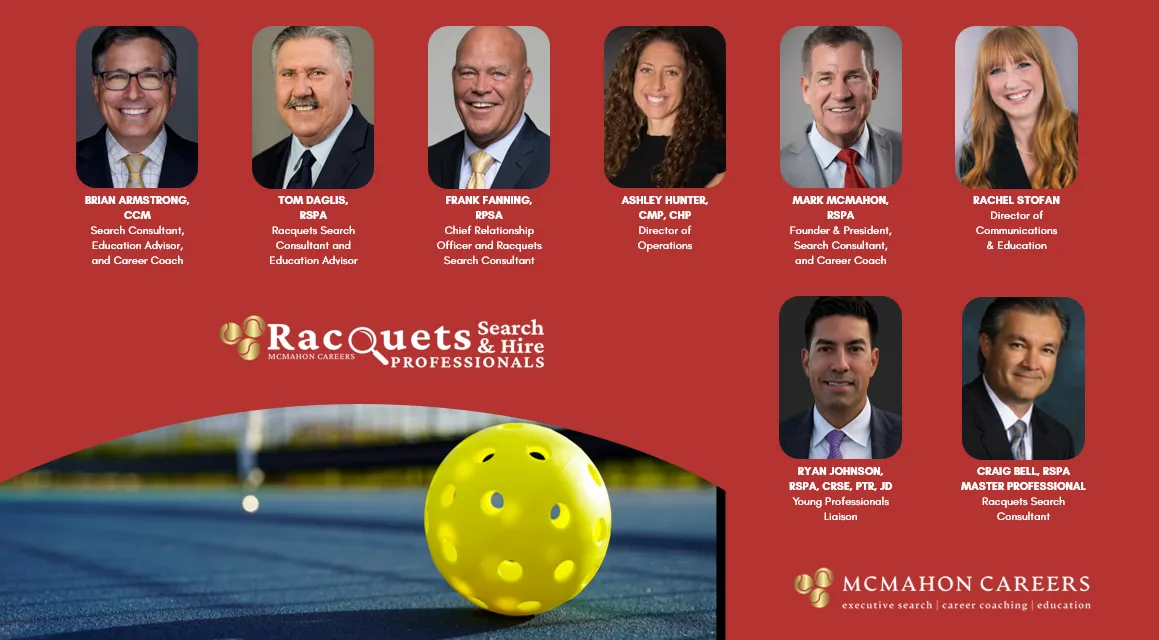 Racquets Search & Hire by McMahon Careers connects excellence in the racquet sports industry. As the only firm dedicated exclusively to careers and jobs in racquet sports, we help racquet sports professionals navigate successful career transitions, and provide executive search, job posting, and hiring support to help clubs secure the right professionals for lasting success.